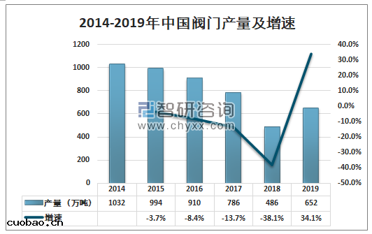 2014-2019年中國(guó)閥門產(chǎn)量及增速