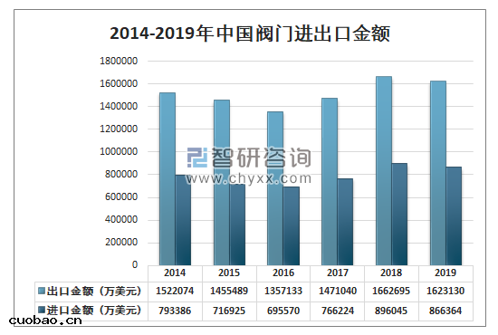 2019年中國(guó)閥門出(chū)口(kǒu)金額1623130萬美元 ,同比下降2.4% ;中國(guó)閥門進口(kǒu)金額866364萬美元 ,同比下降3.3% 。