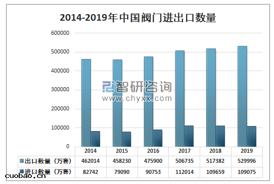 智研(yán)咨詢發佈的《2020-2026年中國(guó)閥門行業(yè)市場供需形(xíng)勢及發展趨勢研(yán)究報告(gào)》數據(fù)顯示 :中國(guó)閥門出(chū)口(kǒu)數量一直大於進口(kǒu)數量 。2019年中國(guó)閥門出(chū)口(kǒu)數量529996萬套 ,同比增長2.4% ;中國(guó)閥門進口(kǒu)數量109075萬套 ,同比下降0.5% 。